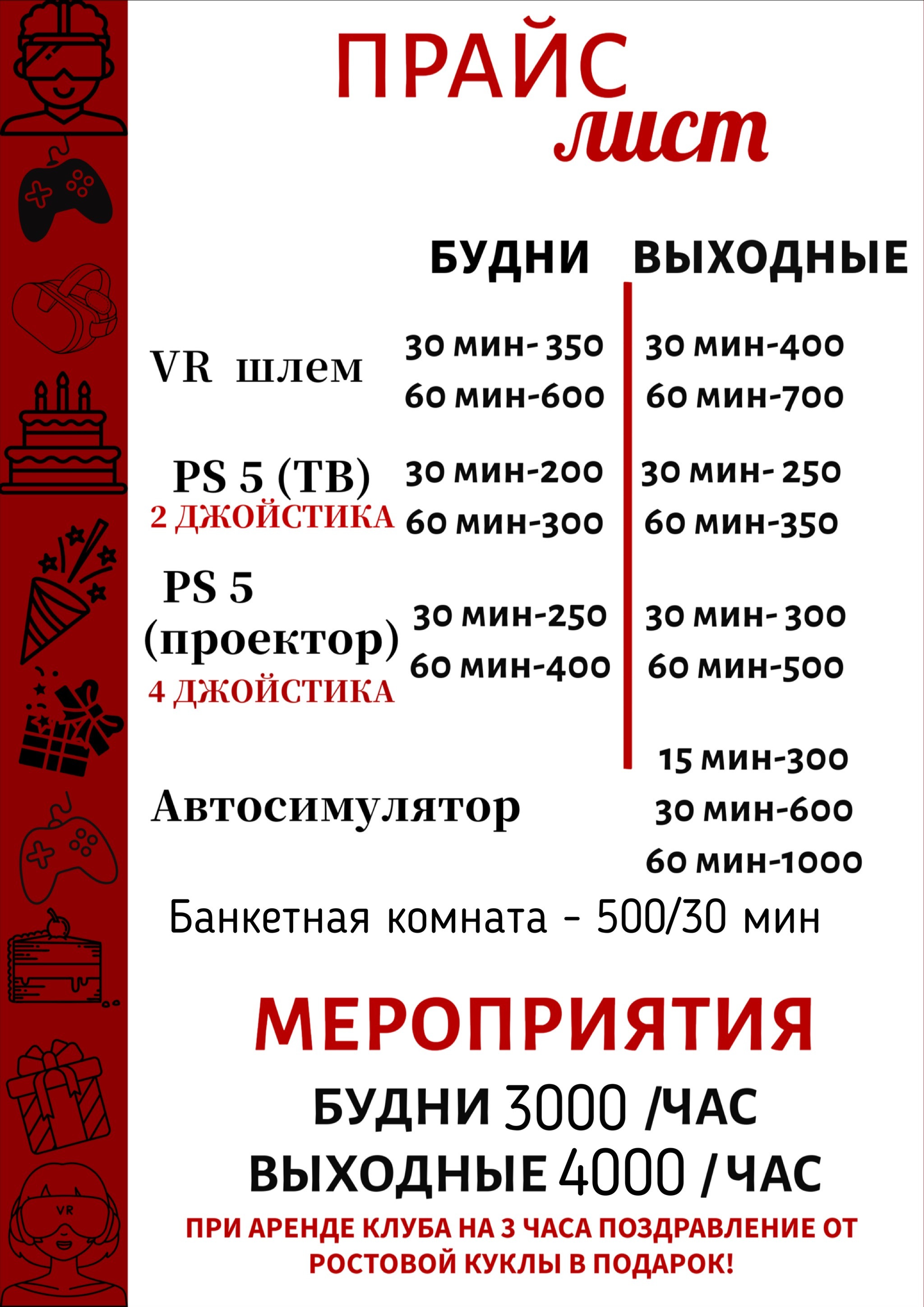 Будни 3000р/час, выходные 4000р/час